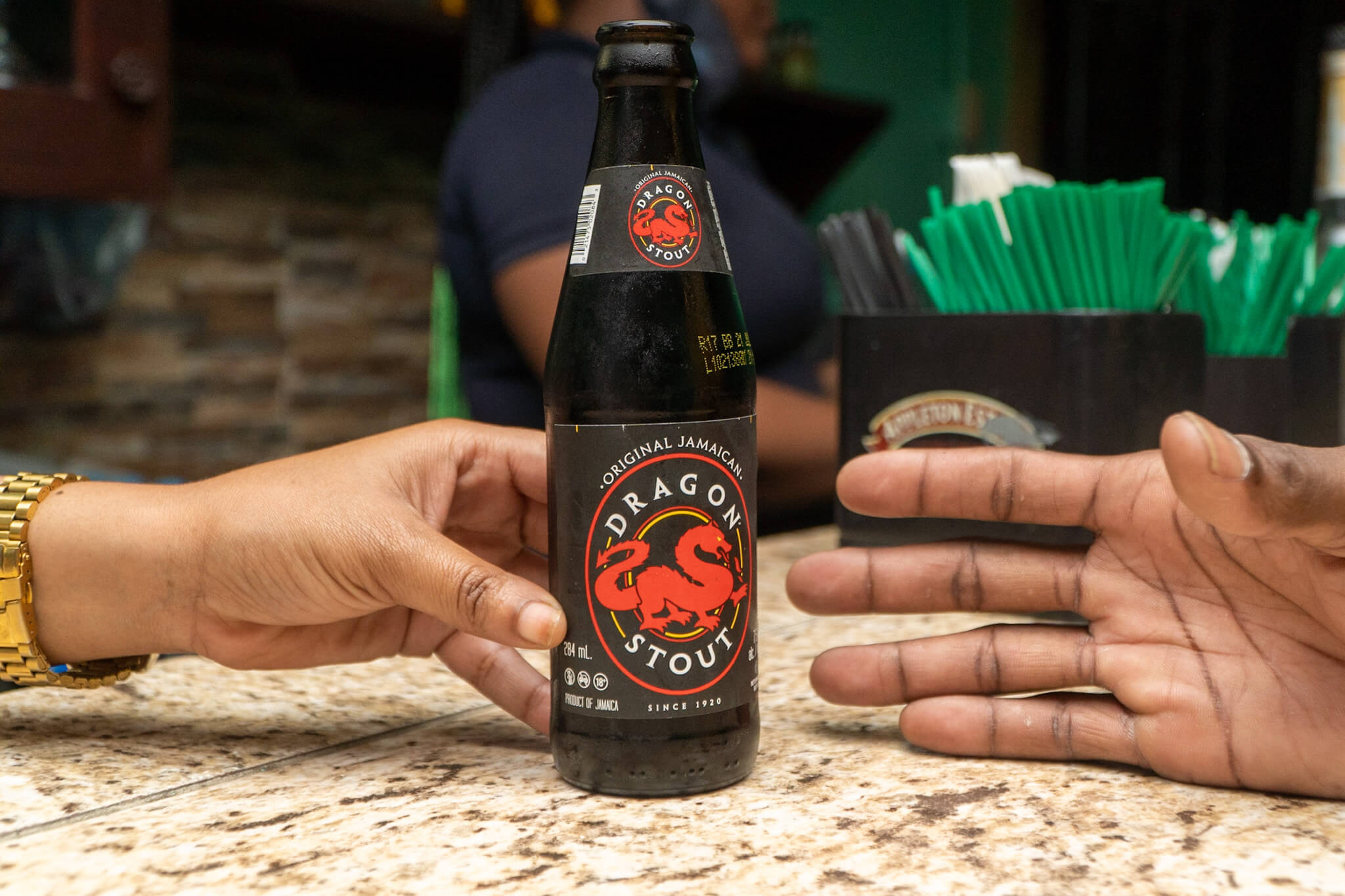 Jamaican Girl eating saltfish fritters at Restaurant in Kingston